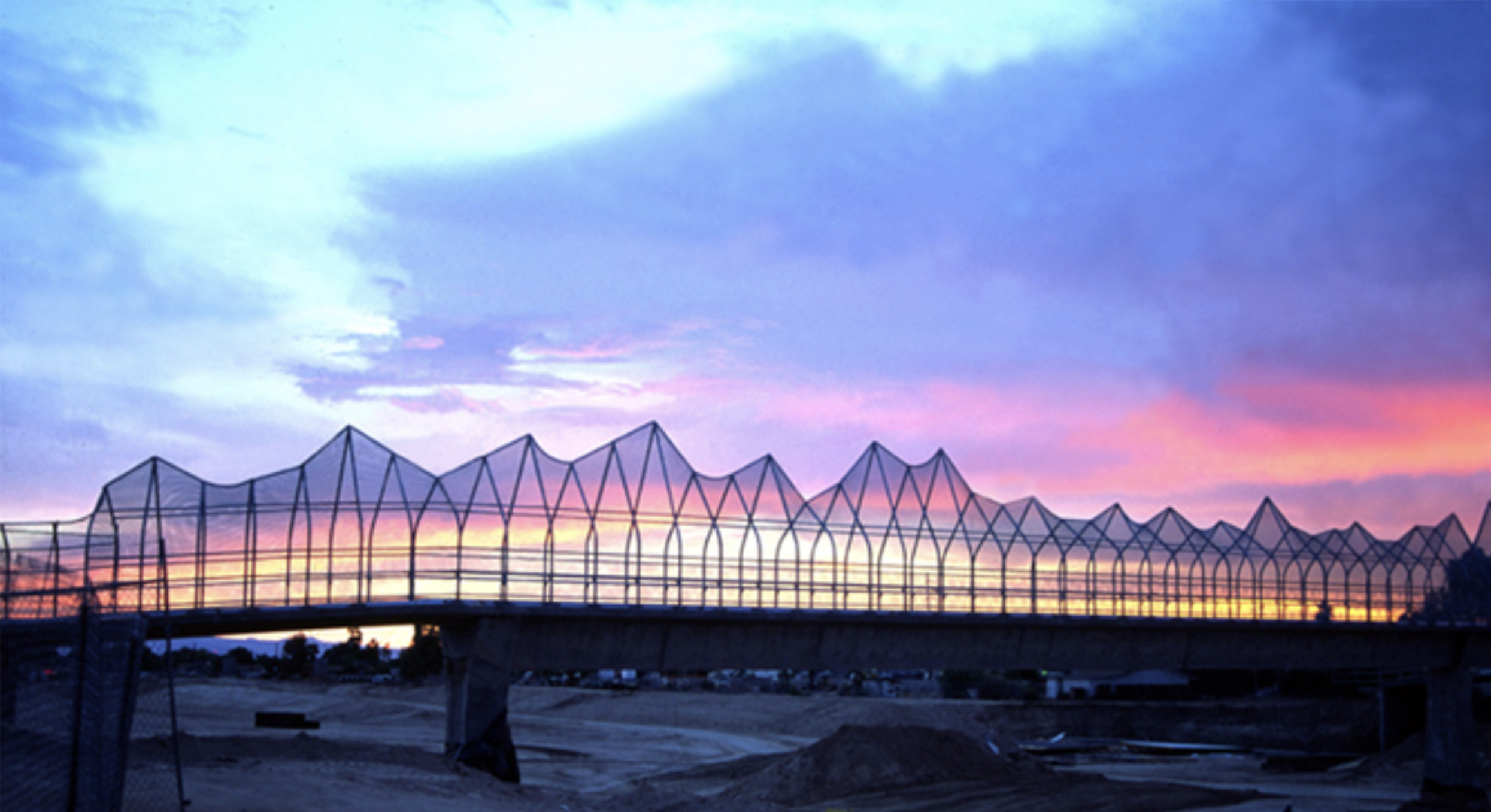 The Mountain Pass concept was inspired by the jagged profile of the nearby Piestewa Mountain range. The design uses the flexible qualities of chain link fencing to meet the safety requirements for pedestrian bridges. Lundquist worked with SVR Inc. and HDR Engineers to develop the concept. The project is a joint effort between the City of Phoenix and the Arizona Department of Transportation. Materials: Concrete, Steel and Chain Link. Length 300’ Ht.16’